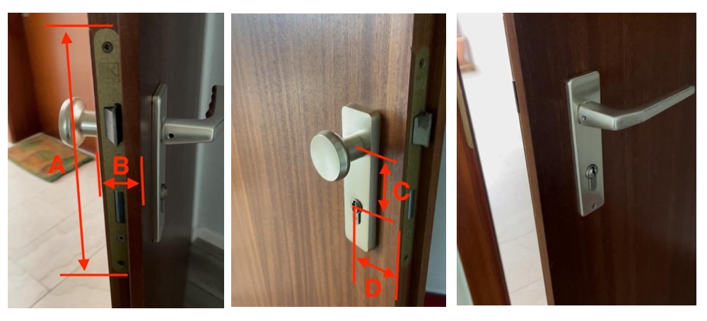 2. Si votre porte s’ouvre vers l’intérieur, prenez trois photos de votre serrure et donnez-nous les dimensions A, B, C, D